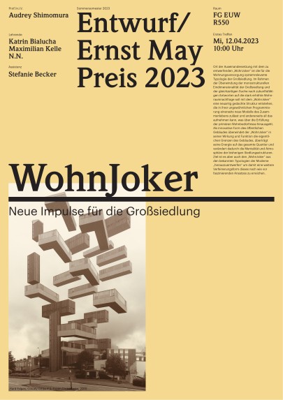 Ort der Auseinandersetzung mit dem zu entwerfenden „WohnJoker“ ist die für die Wohnungsversorgung systemrelevante Typologie der Großsiedlung. Im Rahmen der Überwindung der monostrukturellen Eindimensionalität der Großsiedlung und der gleichzeitigen Suche nach zukunftsfähigen Antworten auf die stark erhöhte Wohnraumnachfrage soll mit dem „WohnJoker“ eine neuartig gedachte Struktur entstehen, die in ihrer ungewöhnlichen Programmierung einerseits neue Modelle des Zusammenlebens zulässt und andererseits all das aufnehmen kann, was über die Erfüllung der primären Wohnbedürfnisse hinausgeht. Als innovative Form des öffentlichen Gebäudes überwindet der „WohnJoker“ in seiner Wirkung und Funktion die eigentlichen Grenzen des Gebäudes, überträgt seine Energie auf das gesamte Quartier und verändert dadurch die Mentalität und Atmosphäre der bisherigen Siedlungsstrukturen. Ziel ist es aber auch den „WohnJoker“ aus den bekannten Typologien der Moderne „herauszuentwerfen“ um damit eine weitere Verfeinerungsform dieses nach wie vor faszinierenden Ansatzes zu erreichen.