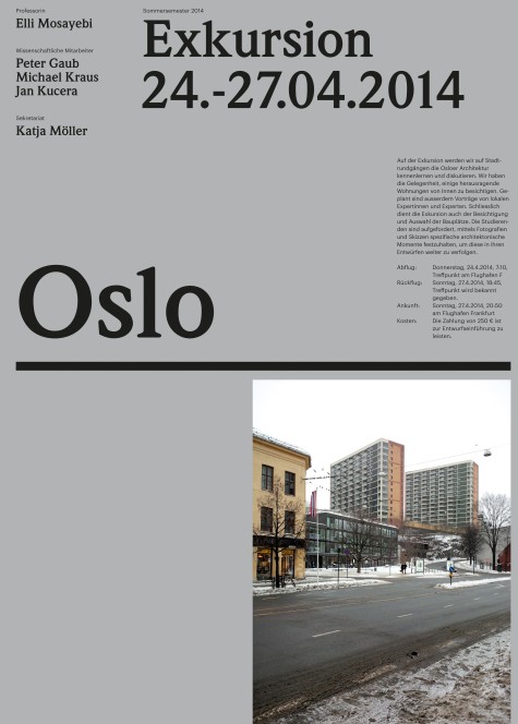 «Wohnen in der Stadt» bildet in den kommenden vier Semestern den Schwerpunkt unserer Auseinandersetzung mit Architektur und Wohnungsbau. Dieser Fokus ist der Beobachtung geschuldet, dass Städte als Arbeits- und Lebensräume aus ökonomischen, ökologischen und nicht zuletzt kulturellen Gründen wieder an Attraktivität gewinnen und in den letzten Jahren einen Bevölkerungszuwachs erlebten. Um Erkenntnisse darüber zu erlangen, welche städtischen Wohnformen existieren und wie in europäischen Städten Wohnungsbau produziert wird, ist die Beschäftigung mit einzelnen Städten notwendig. Oslo ist dafür nach Brüssel, Zagreb und Köln unser viertes Fallbeispiel. Oslo scheint uns wegen seiner städtbaulichen Entwicklung sowie seiner außerordentlich reichen Baukultur besonders interessant. Im Semester werden wir